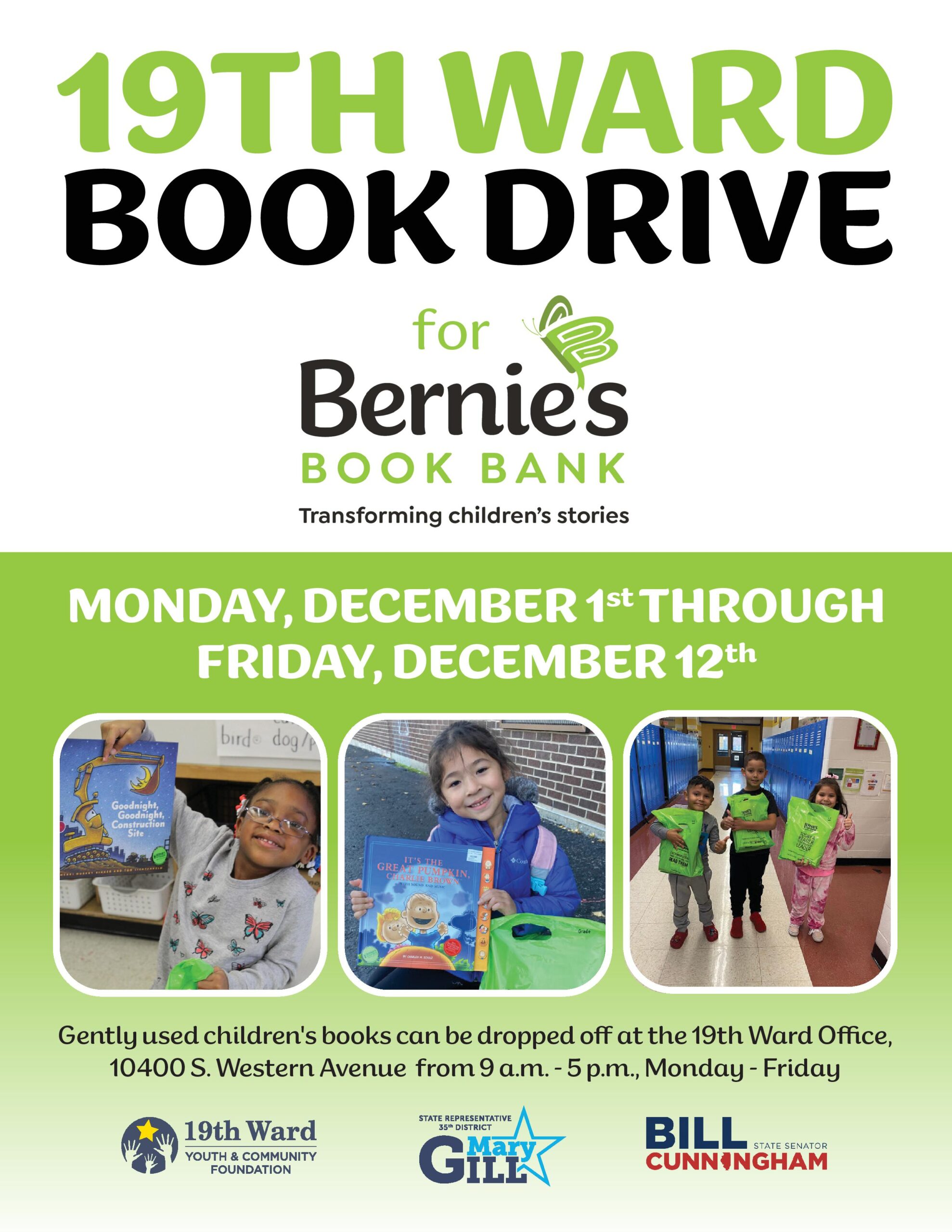Once again, this December, Alderman Matt O’Shea is hosting a used children’s book drive in partnership with Bernie’s Book Bank, a non-profit organization with a mission to distribute quality children’s books to increase book ownership among underserved children throughout Chicagoland. Beginning Monday, December 1st, residents are asked to drop off books at the 19th Ward Office, 10400 S. Western Avenue. The last day to drop off books is Friday, December 12th.